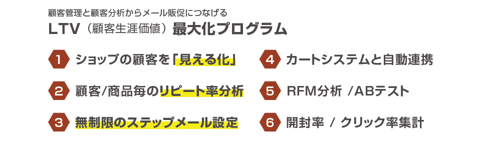 顧客分析結果をメール販促へ繋ぎます。特定の顧客セグメントへ向けたメール配信でメールマーケティングの精度を向上。ステップメールも無制限に設定可能です。